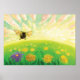 Bumblebee on the Horizon - Bok illustration från barns bok The Buzzing Bumblebee (skriven och illustrerad av Julia Doria). Tidigt morgonängsskugga för vilda blommor. Med strålar från morgonen flyger humlor i sol över en skugga med blommor. Bumblebin (av släktet Bombus) är viktiga pollinerare. Humla pollinerar växter i naturen och bidrar till att behållan av våra ekosystem blir hälsosam. Förlusten av humla kan få ekologiska konsekvenser. Perfektens gåva till humlor och till bin älskare, biodlare och älskare.