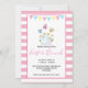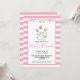 En påsk brunch-inbjudan på en rosa strimlade mönster med ett vitt ram överst. En buntbanderoll sträcker sig över toppen. En illustration av en bunny mellan mamma och baby. Nya daisy i bakgrunden under våren. Vissa vismliknande fjärilar flödar över.