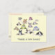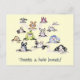 13 Bunny Rabbit Hål har bunnies Popping och Butts hopping med att säga Tack i lustigt söta tecknader. Kortets framsida har en handtryckt text som lyder "Tack hål-klapp". Insidan är en förstorad men nedtonad i bakgrunden, en magenta rolig kanin och text (du kan anpassa) som lyder: "med hoppreciation!" Dessutom tillsätts 4 kräftor röd linjer och ett litet hjärta för att dekorera adress-området med vykort. Kaniner görs i vattenfärg och penna och bläck i grönt, blått, brunt, orange, rosa, grått, svart och vitt. Om du lägger till en egen text (till exempel en namn, det skulle vara underbart om du namn var Bonnie the Bunny) för att skapa ett personlig-meddelande.