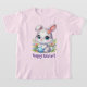 Cute teckning av en vit bunny med stort blått ögon som håller ett blått Påskägg. Glad påsk står under illustrationen av det lila typsnitt som motsvarar blommorna. Finns i många skjorta stilar, färg och storlekar. Om du ändrar skjortan färg ska du se till att välja mellan "vid utskrift, vit underbas" processaa eller så förblir färgerna på bilden inte säker.