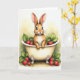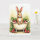 This card features a young, long-eared bunny 🐰 with soft fawn-colored fur and wide, dark eyes framed by fine lashes, giving it a tender, friendly look. The bunny peeks out from a cream-colored basin, as if it’s shyly meeting someone across the table. The basin has an old-fashioned feel with curved sides and small claw-like feet that add a gentle antique touch. Clusters of deep red berries and fresh green leaves spill inside the basin and tumble around its base, like a shared garden find meant for two. Behind the scene, pale greens and soft yellows blur together in a light spring setting, keeping the focus on the bunny and the fruit. A short Easter greeting appears near the top in a soft, warm color, with a smaller line of text placed below in a darker shade for contrast, and a tiny 🌷 tucked beside the words. Dewy highlights shine on the berries, and the cream basin sits on curled feet with berries scattered along the lower edge.