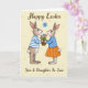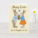 This card shows two bunny-like characters 🐰 standing close on a creamy yellow background sprinkled with tiny amber hearts, their bodies angled toward each other as if sharing a quiet, affectionate moment. One wears a blue-and-white striped top, while the other has a blue polka-dot blouse paired with a pleated orange skirt, and both have small fluffy white tails. Their eyes meet with a tender look, and their hands come together around a woven basket as though offering it as a friendly gift. Inside the basket is a mix of flowers 🌷 with red and blue petals tucked among leafy green stems, bringing a springtime touch to the scene. The illustration uses soft outlines and gentle shading, with light falling evenly across the background to keep the colors calm and airy. A festive greeting appears along the top in flowing lettering, and a shorter line of text sits near the bottom in a matching style and darker ink for contrast. Behind them, the pale yellow field fades slightly toward the edges while the small heart shapes remain scattered around the pair.