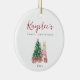 Bunny Rabbit Baby Första julrundan Ceramic Ornament - Den ädla personlig julafton prydnadsmallen har en vidsträckt kanin med vattenfärg, som står bredvid ett festive julgran med vackra omslagna gåvor. Med textrutorna kan du enkelt anpassa valfritt baby namn i ett handskrivet kalligrafiskt skriptteckensnitt och födelseår i ett enkelt, minimalistiskt sans serif. Båda sidor av denna personlighetsdugliga, könsneutrala dekoration för att bevara träd är identiska.