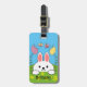 Den berömda vita tecknaden kanin som klämmer ut huvudet ur sin kanin hål. Han är omgiven av grönt gräs och massor av söt färgblommor. Ovanför hans huvud finns två ljusa fjärilar som flödar omkring i det blå vår himlar. Mallar längst fram och tillbaka för att lägga till ditt namn och information.