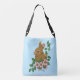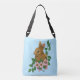En söt brun kanin sitter bland rosa blommor i en ljusblå bakgrund.