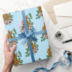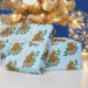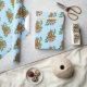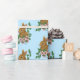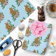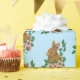 En söt brun kanin sitter bland rosa blommor mot en ljusblå bakgrund