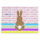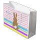 Den här grafikdesignen har en brun silhuettstall, som läggs ovanpå pastelltexten färgad rand och en upprepande text mönster. Större delen av texten är rosa med ord Glad påsk, ovanför bunnys öron på djup lila. Denna konstruktion finns på båda sidor om påsen.