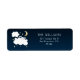 Söt returadressetikett för din lullaby-nöjesbabydusch. Illustration av moln med en kniv som håller huvudet ur en av dem. Anpassa den här produkten genom att lägga till familjens namn och returnera adress. Det finns guld shimmery måne och stjärnor på en marin blå bakgrund. Namibjörnens ursprungliga illustration och design.