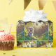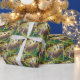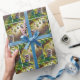 En nyfiken bunny gazar upp på vackert dekorerade ägg som hänger från grenar på en lush, grönt träd