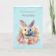 Birthday card with a watercolor image. A white gray bunny rabbit surrounded by a garland of pink and peach roses. For bunny lovers and Easter themes and birthdays and showers.