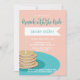Den gulliga pannkakainbjudningskort för möhippan med en bunt av pannkakor på en turkos pläterar.