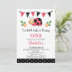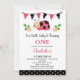 Bunting Red Black Vår lilla Ladybug 1:a födelsedagarinbjudan Sweet ladybug fick första födelsemeddelandeinbjudan för en flicka med en söt nyckelpigg, blommor och en röd, svart och vit flagga. Den här inbjudan på 1:a födelsedagen går att redigera och kan användas i alla åldrar.
