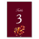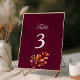 Lägg till en stilren säsongsbetonad touch till din mottagning med detta bröllopsbord nummerkort för hösten. Med en rik burgunderbakgrund och livfulla akvarell höstlöv är denna design perfekt för rustika eller eleganta bröllop i september, oktober eller november. Djärv numrering och klassisk typografi gör placeringen enkel och vacker.