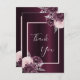 En djup burgunderfärgad bakgrund, dekorerad med burgunderfärgade och rosa blommor. På framsidan stor handskriven text och texten: Tack. Baksida: Personalisera och lägg till din tacknota och namn.