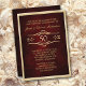 Denna formella inbjudan till bröllopsjubileumsfirande har en gyllene siffra 50 infattad i en hjärtformad gyllene ram på en elegant brännfin burgunderröd bakgrund. Den anpassningsbara texten är också i guld, med bilden och texten infattad i sin helhet med en matchande gyllene ram. Baksidan av inbjudan är burgunderröd. **Observera att bilden är tryckt på kortet, som inte innehåller någon metall.**