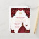 Denna eleganta och glamourösa födelsedagsinbjudan har en vacker prinsessa med brunt hår i en burgunderröd balklänning. Texten kombinerar handskriven skrift och moderna sans serif-teckensnitt för en klassisk och sofistikerad look. Blomsterarrangemangen, fjärilen och det gyllene konfettit skapar den perfekta blandningen av rustik och chic.