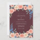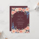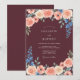Denna design har en rik burgunderbakgrund som vackert kontrasterar mot frodiga persikorösa rosor och ömtåliga rosablommor. Djupblå delphiniumstjälkar och dämpade salvia gröna blad ger en touch av kontrasterande färg och organisk textur. Det stämningsfulla akvarellestetiken skapar en romantisk och sofistikerad atmosfär för en kvällsevent.