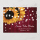 Dessa rustika trädgårdsbröllop sparar datum vykort med solrosor på en röd lada trä bakgrund är idealiska för en burgundisk rustik bröllopsfest inspirerad av solrosor.