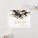 Ett stort tack med blommor i burgundblått, hängande buketter av blått gummi eukalyptus. Det här kortet är accentuerat med ett modernt handskript, tack i faux guld. Copyright © 2016-2020 Bombino Design™.