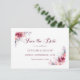 This save the date card introduces your celebration with rich burgundy watercolor tones and soft watercolor floral accents, creating an elegant and romantic first impression for your autumn wedding. The design features a refined serif font paired with a delicate calligraphy script, adding a warm, personal touch to the announcement.