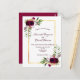 På framsidan: En vit bakgrund med faux guld ram. Dekorerad med mörk burgundblommor, ro, boho stil-fjädrar och grönska. Mallar för namn och bröllop. Namn är skrivet med ett handskript i stil, bugundi färgad brev. Baksida: färgadens bakgrund och blommor.