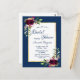 På framsidan: En marin blå och vit bakgrund med faux guld ram. Dekorerad med mörk burgundblommor, ro, boho stil-fjädrar och grönska. Mallar för bridens uppgifter om namn och party. Namn och texten: Möhippan är skriven med ett handskript i stil, marinblått färgad brev. Bakåt: vit bakgrund och ro.
