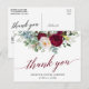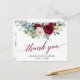 Modern kalligrafi skrift, elegant akvarell burgundy marsala blommor grönska bröllop tack kort innehåller peonior, eucalyptusblad och annan vacker grönska.
