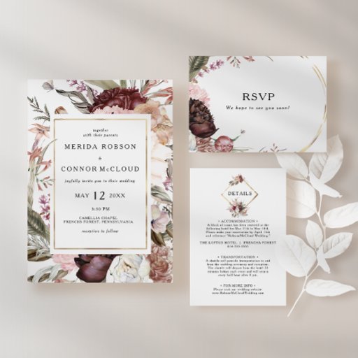 Burgundy Boho Blommigt alla på en bröllopsinbjudan Inbjudningar