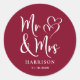 En chic burgundröd dekal för er korrespondens mellan bröllop och party favors med texten "Mr & Mrs" skriven i ett vitt skript och en vit illustration av två hjärtan gått med ihop. Lägg till ditt namn och bröllop-datum.