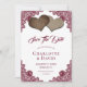 Komplettera din romantiska, strålande bröllopsfest med dessa vackra brickor och snöre bröllop spara datum-kort med två brännhjärtor på en vit bakgrund som dekoreras med burguddig röd blommigt snöre. Matchande objekt är tillgängliga.