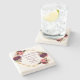 En elegant och romantiskt bröllop spara datum underlägg. Ett geometriskt utformat ram med faux guld-färgad med vattenfärgat ro, blommor i rosa och burgundi. Mallar för namn, datum och ställe i bröllop. Vit bakgrund. Burgundy brev.