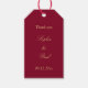 Burgundy Golden Beige Wedding Favor Tack Gift-Märkre, vackra märkre med snyggt i en gyllene skugga av beige (faux guld/guld look) på en klassisk burgundisk bakgrund. Redigera namn för paret och datum för bröllop, med hjälp av onlinens anpassningsmall före beställning. Ordalydelsen "Tack" är också redigerbar, i fodral vill ni ändra den till en annan ordalydelse.