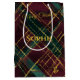 Make your holiday gifts stand out with this personalized burgundy, green, and gold abstract plaid Christmas gift bag. Featuring a modern take on a classic plaid design with “Merry Christmas” and customizable with the recipient's name, this bag adds a unique artistic flair to any present. Perfect for those who appreciate contemporary holiday aesthetics, this durable gift bag combines festive colors with a personalized touch for a memorable holiday season.