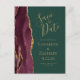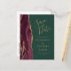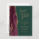 Detta eleganta moderna postkort för att spara datumet har en burgunderfärgad akvarell-agat-kant med falskt guldglitter. Anpassa enkelt den guld färgade texten på en smaragdgrön bakgrund. Baksidan upprepar informationen, tillsammans med en anpassningsbar returadress.
