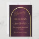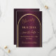 A Spara datumkortet för en 70:e födelsedagsfest. En burgundisk bakgrund, dekorerad med faux guld-båge. Anpassa och lägg till ett datum och ditt namn. Texten: Sjuttio och Spara datumet skrivs med ett stort trendig-handskript med stil.
