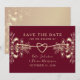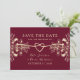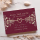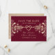 Romantisk burgunder och guld blommig spara datum-kort, perfekt för hösthöllpningar. Eleganta chinoiserieblommor och tidlös kalligrafi gör detta idealiskt för oktober eller hösthöllpningar.