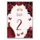 De här vackra quinceañera-bordsnumren har en gräns av burgunda vattenfärgblommor på en blek burgundär bakgrund. En guld tiara, en mörk-ordförande i en burgundisk prinsessa-klänning och små burgiga fjärilar dekorerar texten. Ord "bord" och talet visas i burgundskript för handskrift.