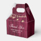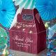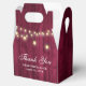 Rustik burgunderbröllop tack favor låda med strängar av ljus på en gammal träd bakgrund.