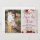 Bohemian Burgundy Marsala Blommig Spara datum Foto kort. Bohemian burgunder, marsala, rosa akvarellrosor, botanisk blommarrangemang bröllopsdesign med gröna blad på grå ek träbakgrund. Har en elegant handskriven typografi „Spara datum” design. Perfekt val för höst eller vinter bröllop. #3337