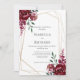 Anpassadets bröllopsinbjudan i rent vitt. Har söt blommigt bouquets i djup rik burgundy marsala röd toner, med ett modernt guld geometriskt ram.