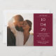 Ett modernt, minimalistiskt spara-date-kort med speciella datum-, foto- och bröllop-detaljer som anges i klassisk, chic-typografi på burgundröd bakgrund. Designad av Thisisnotme©