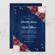 Elegant Rustic navy blue, burgundy and blommigt bröllopsinbjudan med burgundy och rosa ros på en rustik träbakgrund. Utformning av perfekt för att bjuda in gästerna till din marinblå, burgundära och , roliga bröllopsfest. Matchande objekt är tillgängliga.