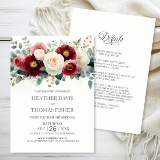 Burgundy och Vita Blommigten Bröllop Inbjudningar