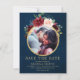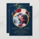 Vattenfärg Burgundy Red Navy Blommigt Rustic Boho Spara datumfotokortet. Perfekt för ett fallbröllop. Utformningen har en fantastisk bukett av burgundy/Marsala, persikor, marinblommor/ro med matchande löv i ram som är formad i guld ring. Hitta fler matchande utformningar och variationer i min "blissweddingpaperie"-butik. Och kontakta mig gärna om du vill ha anpassningsbar.