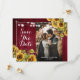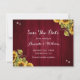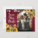 Fotokort för vattenfärgad rustik burgundy och solrosolja bröllop spara datum med solblommor på en lada med träbakgrund, försedd med strängen ljus. Perfekt kortdesign för en burgundisk rustik land, trädgård, trädgård eller ladugård bröllopsfest som inspirerats av solrosblommor.