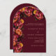 En bågformad bröllopsinbjudan. För en elegant och ett romantiskt bröllop. En burgundär bakgrund som dekoreras med blommigtar för burgundi, rosa och persikofärgad. Anpassa och lägg till namn och information.