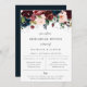 Elegant akvarellblommig arrangemang i burgunderröd, rosenskymning rosa, marinblå och frodiga gröna färger, inbjudan till övningsmiddag. Chic och modern typsnittsdesign. Baksidan av kortet har en solid mörk marinblå färg.