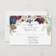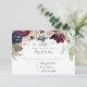 Vacker juvelton elegant bröllopsinbjudan med vin, burgundy och marinblå blommor med dämpad höstflora och rosablommiga och dammiga blå blomsterelement. Designen är skapad av den internationellt licensierade artisten och designern Audrey Jeanne Roberts.
