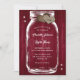 Anpassningsbar Rustic burgundy bröllopsinbjudning med en mason burk och burlap-hjärtan på en lada-träbakgrund. Anpassa enkelt den här bröllopsinbjudan till Mason burk med dina bröllop-uppgifter.