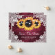 Personlig burgunda rustiska solroskort bröllop spara datum som innehåller solblommor mot en rustisk träbakgrund som är försedd med vit blommigt snöre och sträng ljus. Vårt burgunska rustiska blommigt bröllop spara datum-kort är perfekt för en rustisk land, eller lada-bröllopsfest som inspirerats av solblommor.